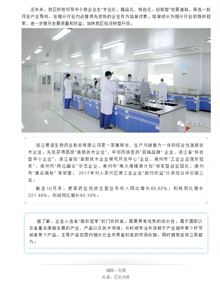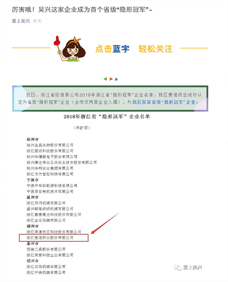 恭喜愛諾藥業(yè)成為吳興區(qū)首個(gè)省級(jí)“隱形冠軍”~