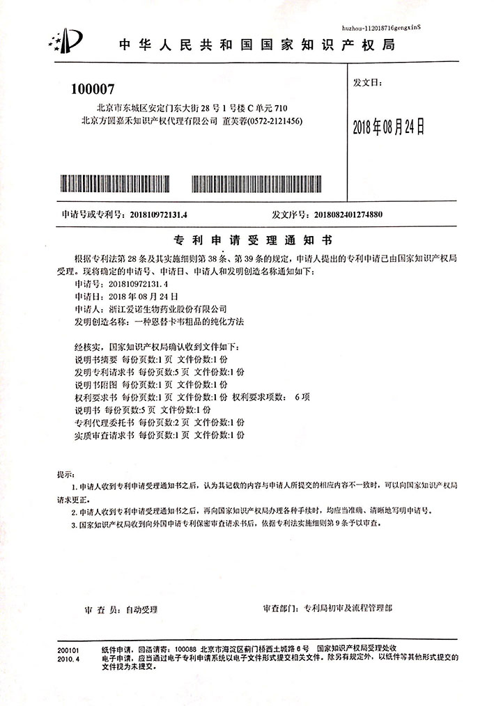 喜報(bào):恭喜浙江愛諾生物藥業(yè)股份有限公司獲得專利:“一種恩替卡韋粗品的純化方法”,在此特向一直以來關(guān)心支持本企業(yè)的各位領(lǐng)導(dǎo),各位朋友衷心表示感謝!