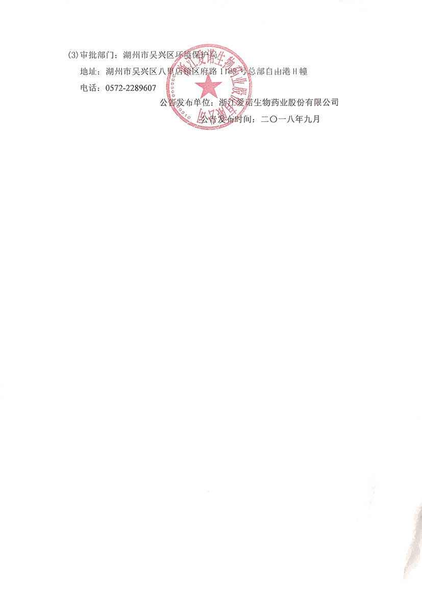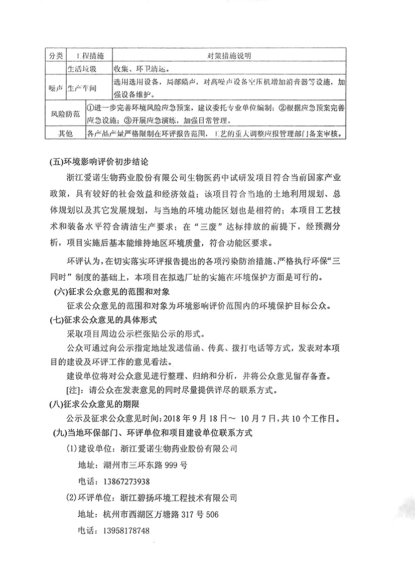 浙江愛諾生物藥業股份有限公司生物醫藥中試研發項目環境影響報告書環保公示
