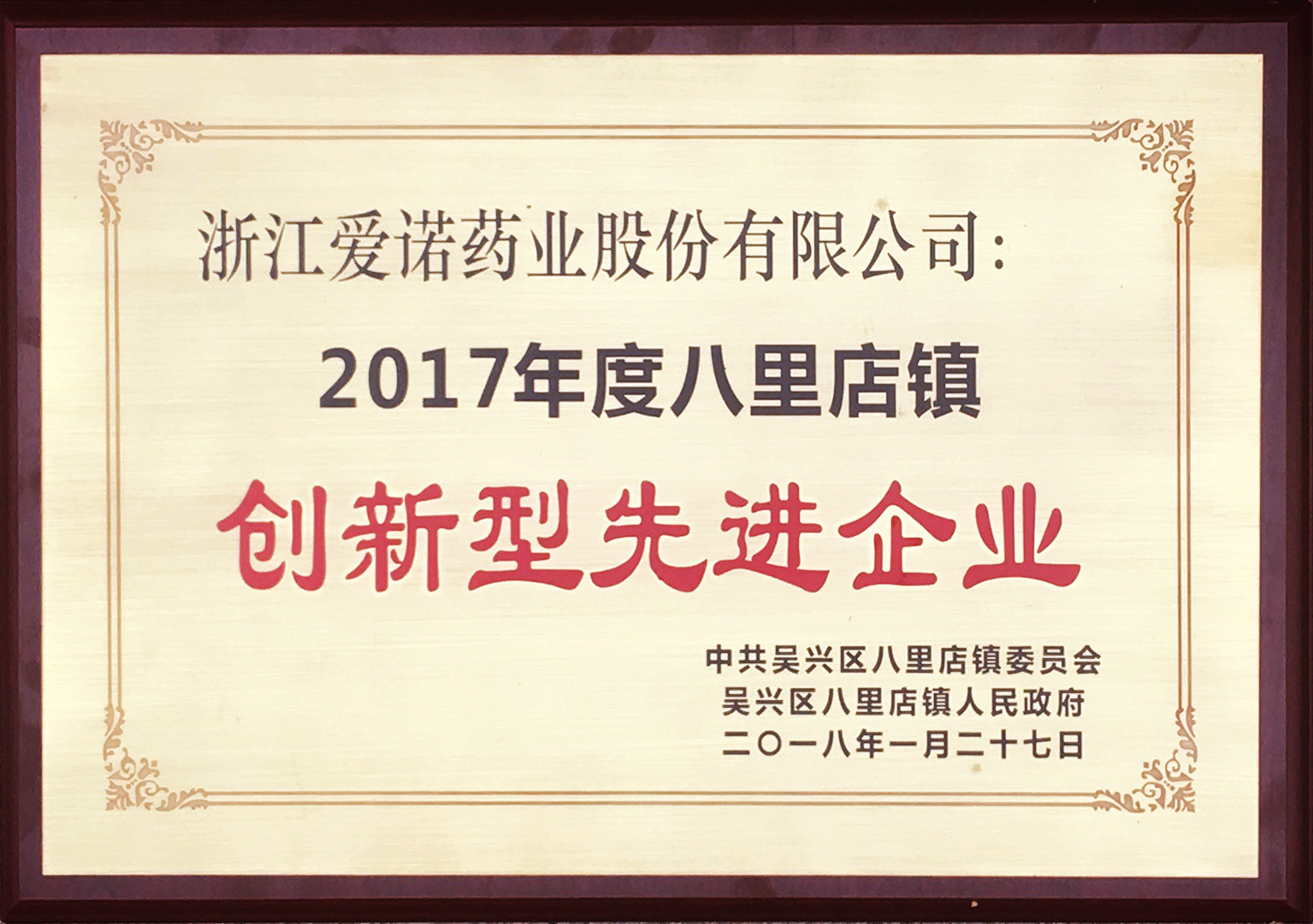 愛諾藥業榮獲2017年度八里店鎮創新型先進企業