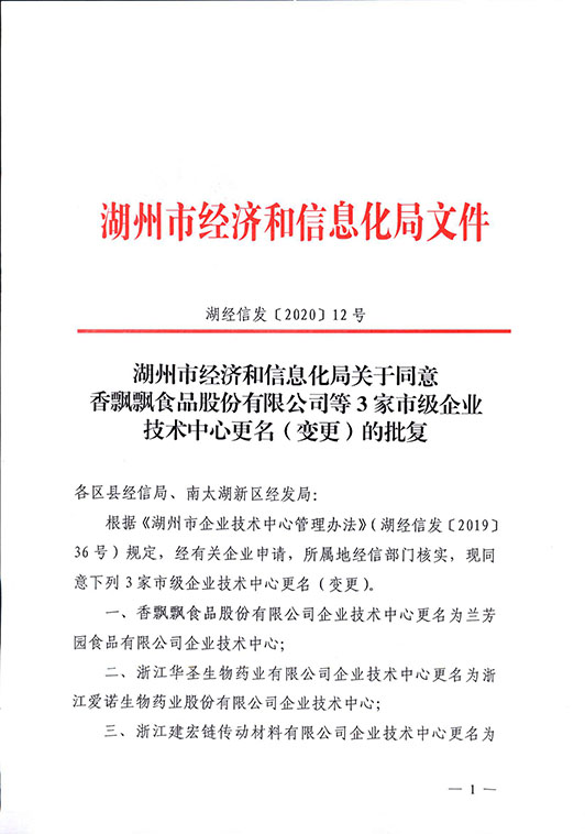 湖州經濟和信息化局關于同意香飄飄食品股份有限公司等3家市級企業技術中心更名(變更)的批復.pdf