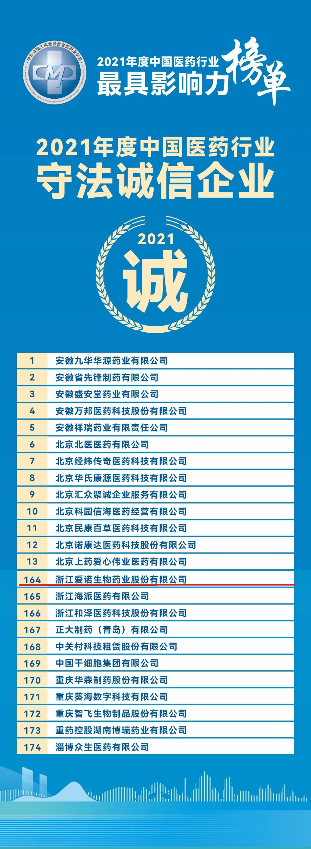 熱烈祝賀“愛諾藥業”榮獲2021年度中國醫藥行業守法誠信企業
